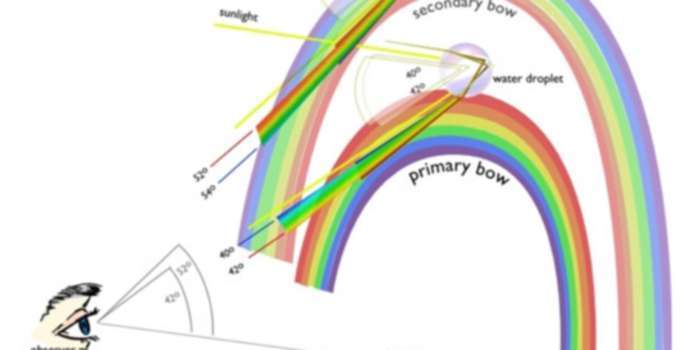 Básicamente, la luz entra en la gota y se refracta, luego se refleja contra la parte posterior de la gota y al volver hacia atrás vuelve a refractarse y sale de la misma. Sin embargo, algo de la luz puede volver a reflejarse y salir por otro lugar, refractándose de nuevo. En este último caso, se produce un segundo arco iris.