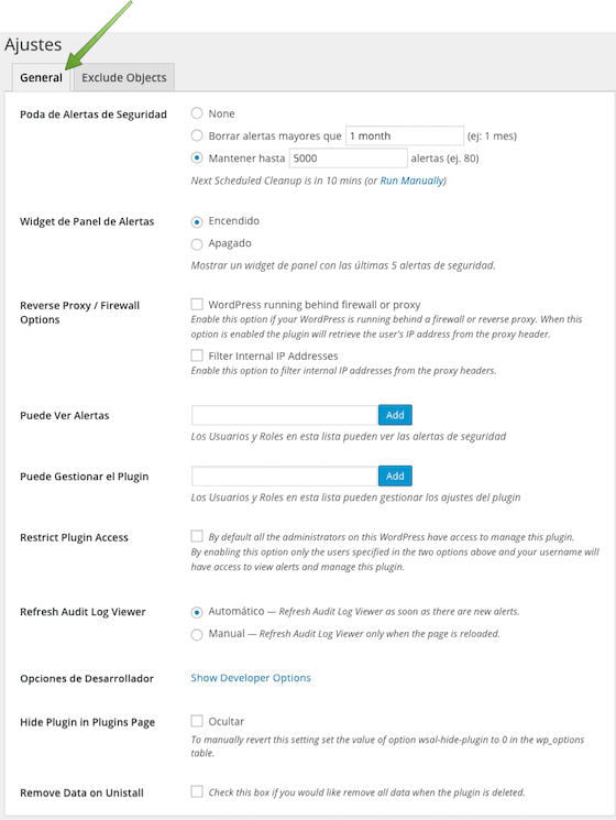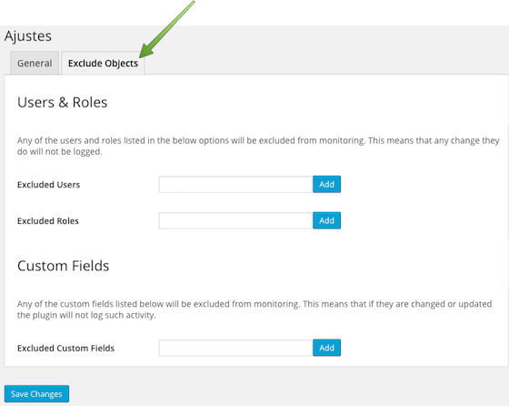 La pestaña Exclude Objects nos permitirá indicarle al plugin aquellos usuarios, tipos de roles, o campos personalizados que deberán ser excluidos de cualquier registro y monitoreo.