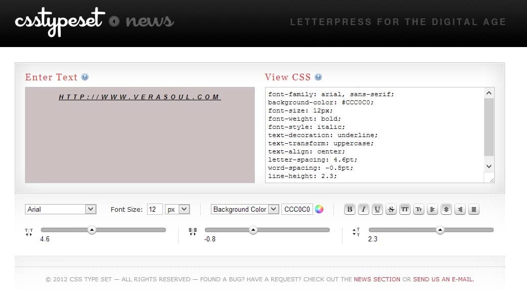La ventana de edición de Csstypeset es muy fácil de utilizar, tan solo tenemos que introducir el texto y asignarle el formato que deseamos haciendo uso de las herramientas que ofrece el servicio. Una vez hayamos obtenido el diseño deseado, simplemente tenemos que copiar el código generado dentro de la ventana View CSS y añadirlo a nuestra hoja de estilos para que podamos ver los resultados en nuestra web.