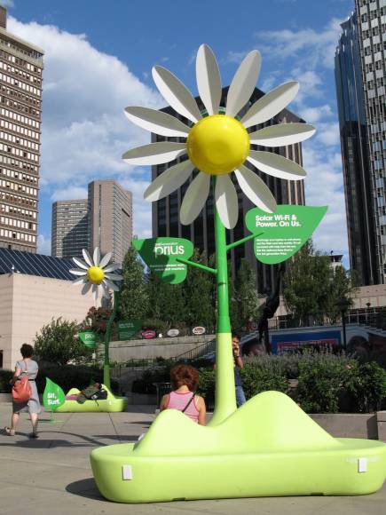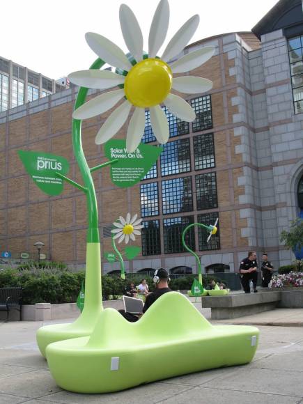 Una curiosa camapaña que sin duda, alegrará a muchos por la tecnología que emplea y las vistas a todas aquellas que les encanten las flores. Se trata de «flores gigantes» como la que puedes ver en la fotografía, las cuales estan dotadas de unos paneles solares para ofrecerte electricidad de forma gratuita y así poder recargar tus baterías, ya sea del portátil, teléfono móvil, etc…, pero lo más curioso es que además de eso, hacen de puntos de conexión WiFi también gratuítos.