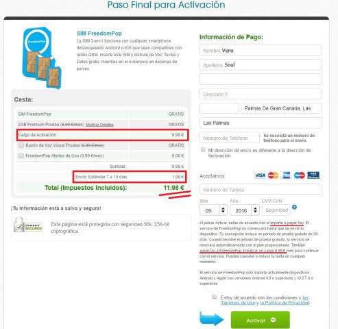 A decir verdad, me parece lógico que quieran cobrar el envío de la propia SIM (1.99€), pero es que no solo es eso, sino que además nos cobran por la activación 9.99€. Además, pasado los 30 días debemos abonar 8.99€ al mes por el servicio, con lo cual, como podrás comprobar de gratis no tiene nada, salvo esos 30 días, que ya podrían aclarar de otra forma. Atrás quedó la promesa de FreedomPop sobre un servicio móvil básico 100% gratis.