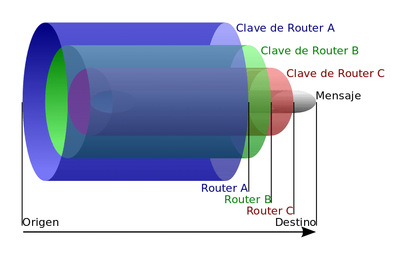 Si analizamos la imagen anterior, cada Router (A, B y C) equivale a las diferentes capas por donde pasa el mensaje antes de llegar a su destino final.Con ello se consigue un sistema diseñado para ser flexible e implementar mejoras, aunque es además resistente frente a muchos tipos de ataques.