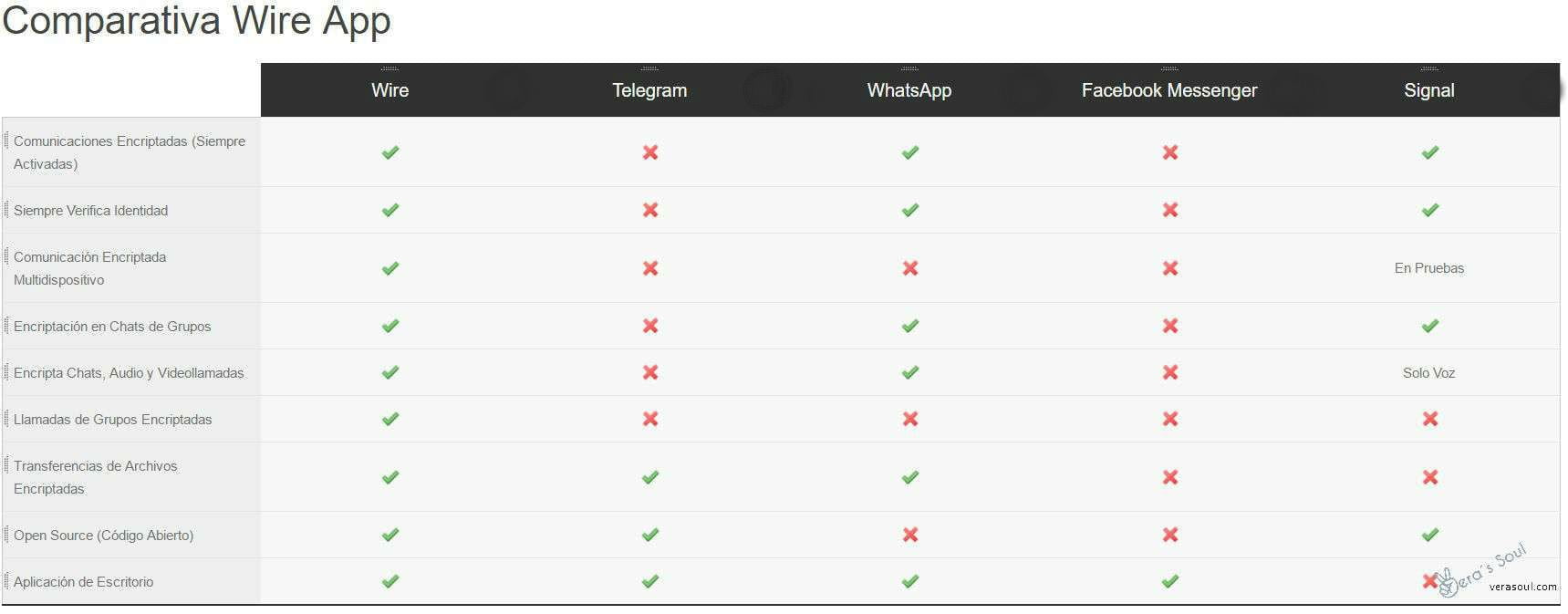 Wire es una sofisticada aplicación de mensajería que conjuga lo mejor de Telegram y WhatsApp, esquivando al mismo tiempo los defectos de estas aplicaciones. De WhatsApp se ha criticado su privacidad sobre todo ahora que Facebook hará una explotación comercial de las comunicaciones, pero también la ausencia de videollamadas. Las críticas hacia Telegram han llegado a cuenta de su incapacidad para realizar llamadas y videollamadas (el servicio ha querido centrarse únicamente en los mensajes de textos) y, además, existe cierta incertidumbre, ya que este servicio es gratuito y no se plantea ninguna monetización de cara a un futuro, es decir, los gastos de mantenimiento de Telegram los soporta el magnate ruso Pável Durov y como él mismo confirmó, no pretende que su app sea un modelo de negocio.